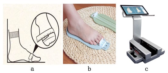 Foot data acquisition method. (a) Ruler; (b) Foot measuring device; (c) Foot scanner.