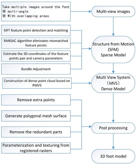 The core research tasks of 3D computer vision are scene structure and camera pose, as well as camera parameters. Based on the principle of the camera calibration, the SFM is used for sparse reconstruction. In the process of sparse reconstruction, after taking multiple images of the foot, we used the Scale Invariant Feature Transform (SIFT) algorithm and the Random Sample Consensus (RANSAC) algorithm, estimating the 3D coordinates of the feature points pair and camera parameters, and used the Bundle Adjustment. After that, we used the PMVS [18] to perform dense point cloud reconstruction. After a series of post-processing processes, we obtained the foot 3D model. The overall experimental process is shown in Figure 2. The following is an introduction to the method used in the paper.