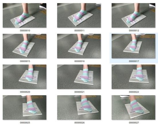 In this experiment, the volunteer wore striped sock stands on the magazine, we used the mobile phone to take a video around the feet, then used Free Studio to capture a photo every second. Finally, we obtained 84 images. Part of the images is shown in Figure 4. The volunteer wore striped socks so that we could extract more texture features and achieve a better reconstruction effect. On the one hand, the magazine was used to distinguish from the surrounding environment; on the other hand, it was used as a calibration object to facilitate the later measurement. To ensure more overlap in the images, we used the Free Studio to turn the video into images.