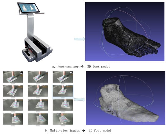 Accurately measuring users’ data has become an exigent and intractable subject for high-end customization. At present, most companies still use backward traditional contact manual measurement methods. The traditional foot data collection methods can be divided into two sorts. The first is manual measurement as shown in Figure 1a,b. Using a cloth ruler, steel ruler and other tools may lead to a deviation due to the errors in the measurement position or technique. Besides, the work efficiency and the repetition rate are relatively low, and the error between different surveyors is large. The second is the foot scanner, which uses laser scanning—the laser lines are emitted from one or more laser sources at a certain frequency. Multiple cameras are used to collect multiple frames of images from different angles to obtain foot data. However, the equipment is expensive, bulky, has poor portability and high maintenance cost in the later stages. To tackle the problems of large measurement error manual measurement and the poor convenience of foot scanners, this paper proposes a 3D model reconstruction method based on mobile phone photographs.