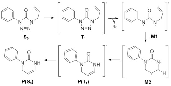 The photochemistry of 1-phenyl-4-allyl-tetrazol-5-one (ATZ) has been studied with excitation at , and several reaction pathways have been proposed with the products characterised by various analytical techniques [17]. The photoproducts are strongly dependent of the solvent: Pyrimidinone was identified as the main product, in the case of protic solvents, and in aprotic solvents, isocyanates, and anilines. Based on the experimental observations, the photochemical mechanism of ATZ has been postulated for this reaction pathway, and it involves the formation of a triplet biradical intermediary after the photoextrusion of molecular nitrogen [18]. Pyrimidinone is formed after this intermediate undergoes a conformational rearrangement through the allylic group and a proton transfer. This proton transfer has been found to be intramolecular, as its occurrence is detected in both protic and aprotic solvents [18]. Based on the experimental detection of photoproducts, a mechanism has been postulated ad-hoc [18,26], which assumes the relevance of the conformational rearrangements of the triplet intermediaries.