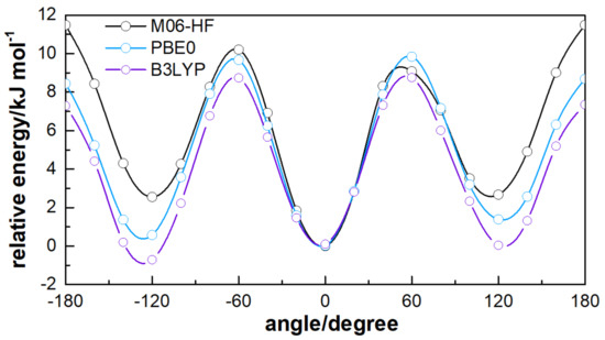ATZ shown in Figure 2 is known to have multiple conformers according to the spatial orientation of three main planes: Allylic group, tetrazolic, and phenyl rings. For the current work, the relevant conformers arise from the torsion of the allylic group, defined by the dihedral angle . Figure 3 shows the dihedral angle dependence for partially optimised structures of ATZ- using PCM. For each point, an optimisation of all degrees of freedom, except the angle, is carried out to establish the torsion potential. The torsion behaviour of is similar for PBE0 and M06-HF functionals, the being the most stable structure. For B3LYP, the most stable conformer is the one with ; a similar trend has been also observed in gas-phase studies [19]. The energetic difference between the most stable conformer and the other minimums is larger in the case of M06-HF (). Note also that the M06-HF shows a more repulsive behaviour when departing from the global minimum, in particular for the with a barrier height of .