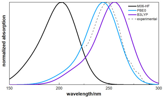 The excitation transitions on the singlet states of ATZ at equilibrium geometry of the more stable conformer have been calculated using the TDDFT with the Tamm–Dancoff approximation [27]. Table 2 shows the vertical excitation energies, the components of the transition momentum, and the oscillator strength for the leading terms of the singlet manifold. In two of the functionals here studied, B3LYP and PBE0, the larger value of the oscillator strength is associated to the transition , although the energy gap is larger in the case of PBE0. The M06-HF results show that the most intense transition corresponds to the with a oscillator strength of 0.66 and an energy of . From the TDDFT calculation, the absorption spectrum has been simulated, as shown in Figure 4, by using Gaussian functions centred at the calculated wavelengths and with bandwidths-at-half-height equal to 18 nm.