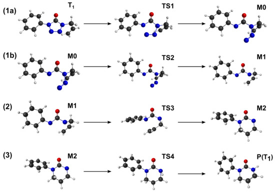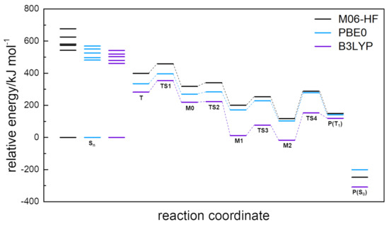 The proposed mechanism occurs from the triplet state of ATZ, populated from intersystem crossing with the singlet excited state. The geometry of the located global minimum for the lower triplet state, , can be found in Table 1 for the three functionals (as before, the full coordinates may be found in the Supplementary Materials). The minimum is located , , and above the for the B3LYP, M06-HF, and PBE0, respectively. Such values may lead to an overestimation of the energy range for the case of M06-HF. However, such an analysis can only be tested with high-accuracy calculations which is out of the scope of the current work. Main changes of the state arises on the dihedral angles of the phenyl group except for the M06-HF functional.