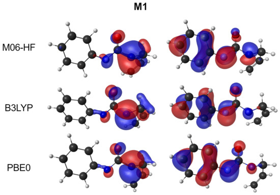 The postulated mechanism states that M1 and possible M2 are biradicals intermediates. Open-shell biradicals can possess a multideterminant (multireference) character, which implies that single determinant methods will fail to describe these molecules in an appropriate way. Reliable descriptions can only be obtained with multireference results. For DFT, some approaches have also been proposed based on unrestricted methods [50]. In the current study, a simpler qualitative approach has been carried out by analysing the populations and free-valence that arise from the calculation. For the M1 intermediary, N(4) has a free valence value of 0.2 and N(1) 0.6. These values show that such atoms will have a biradical character, in particular for N(1) atom. In the case of M2, the biradical character can be found located in atom N(4) (free valence value of 0.7) and C(8) (with 0.8). The birradical character may be also seen in the two semi-occupied molecular orbitals in Figure 6 as the M1 structure has a similar behaviour for all functions.