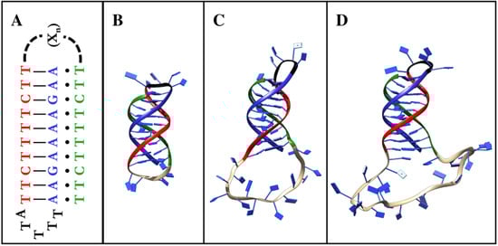 The bases in bold indicate the duplex-forming regions (red and blue ribbons in Figure 1B–D and in Figure S1B–D of Supplementary Materials), the bases in italics represent the triplex-forming region (green ribbon in Figure 1B–D and in Figure S1B–D of Supplementary Materials), and the underlined bases represent the identical 5-base loop and the loop with a variable length (black and grey ribbons respectively in Figure 1B–D and in Figure S1B–D of Supplementary Materials). The three-dimensional structures of the six nanoswitches were built using the fiber and mutate_bases modules of the X3DNA package [31], which were used to independently produce a 10-base triple helix and the single strands representing the TFO and the loops. The PyMol sculpting module (PyMOL Molecular Graphics System, Version 2.0 Schrödinger, LLC; https://pymol.org, accessed on 3 March 2021) was used to connect the DNA fragments through phosphodiester bonds.