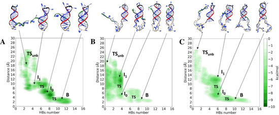 Iso-energetic contour of the free energy surface plotted as a function of the HB number established between the TFO and the DH, and of the distance between their centers of mass for the DIPRO5 (A), DIPRO15 (B) and DIPRO25 (C) systems. The upper structures are the representative configurations of the most populated clusters of the Bound (B), Intermediate (I0 and I1) and Transition (TSunb) states, extracted from the trajectories. The color scheme follows that described in Figure 1.