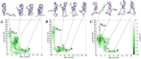 The TFO unbinding profile from the double helix was analyzed in terms of its free energy surface (FES) and plotted as a function of the number of hydrogen bonds (HBs) established between the TFO and the DH, and of the distance between their centers of mass, as reported in Figure 2 and Figure 3 for the diprotic and tetraprotic switches, respectively. For all of the six systems, the FES shows the presence of three minima corresponding to the bound state (B) and two intermediate (I0 and I1) states, separated by two transition states (Ts and Tsunb). In particular, the Tsunb state represents the final step of the ABMD simulations (Figure 2A–C or Figure 3A–C). For each analyzed structure, conformations belonging to the B, I and Tsunb states were clustered, and the representative structures are shown in the upper part of Figure 2A–C or Figure 3A–C.