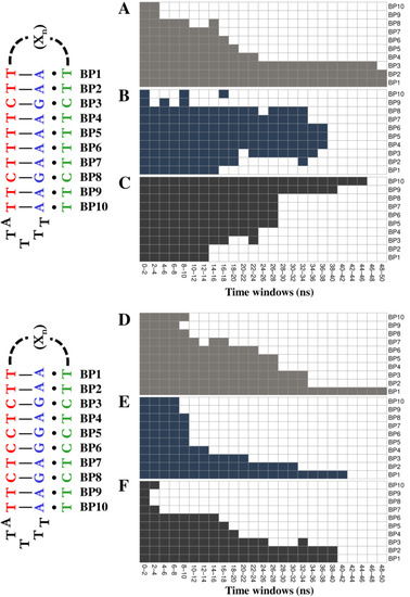 Per-base unbinding profile of TFO from the DH as a function of time. For each 2-ns time window, the distance between the centers of mass of the TFO and of the DH C2′ atoms was calculated, and the corresponding rectangle in the plot was colored if the average distance was lower than 3.2 Å. A white rectangle indicates the loss of the interaction. The profile is reported for the DIPRO5 (A), DIPRO15 (B), DIPRO25 (C), TETRA5 (D), TETRA15 (E) and TETRA25 (F) switches.