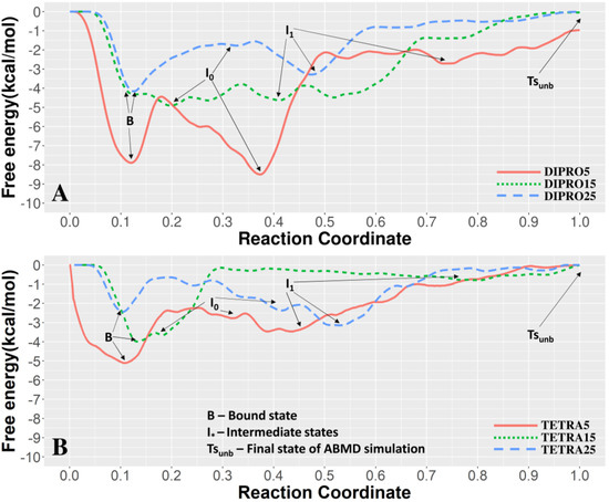 A comparative free energy profile along a minimum energy path, as a function of a generalized reaction coordinate, is plotted in Figure 5A,B for the DIPRO and TETRA switches, respectively. The energy value of the B state for the DIPRO5 switch (Figure 5A red line) is two times lower than those observed for the DIPRO15 and DIPRO25 systems (Figure 5A green and blue lines, respectively). Moreover, the DIPRO5 B and I1 states are separated by a relatively high activation energy (Figure 5A, red line), again almost twice than that required for the TFO unbinding in the DIPRO15 and DIPRO25 systems (Figure 5A, green and blue lines, respectively). In the case of the TETRA5 (Figure 5B, red line), TETRA15 (Figure 5B, blue line) and TETRA25 switches (Figure 5B, green line), the energy values observed for the B state are half of those observed for the diprotic switches, with the I0 and I1 states separated by very low activation energies, which favour the transition towards the unbound states.