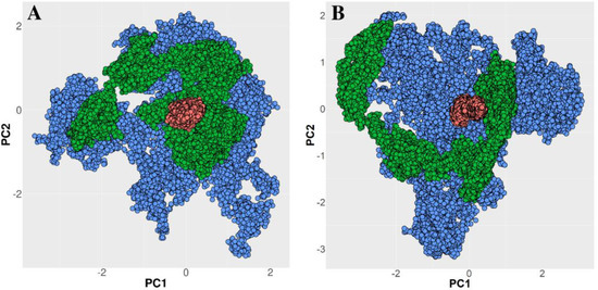 (A) 2D projection of the principal component of the motions of the C2′ atoms of the variable loop of the DIPRO5 (red circles), DIPRO15 (green circles) and DIPRO25 (blue circles) switches. (B) 2D projection of the principal component of the motions of the C2′ atoms of the variable loop of the TETRA5 (red circles), TETRA15 (green circles) and TETRA25 (blue circles) switches.