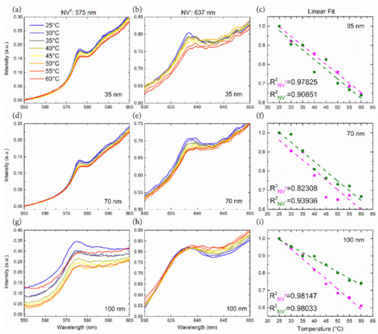 Fluorescence spectra of NV0 and NV− centres in HPHT nanodiamonds of 35 nm (a,b), 70 nm (d,e) and 100 nm (g,h) for temperatures from 25 °C to 60 °C. The dependence of the maximum fluorescence intensity on temperature (c,f,i) is obtained through normalization and using a Gaussian model. A linear fit gives R2 values are 0.97825, 0.82308 and 0.98147 for the NV0 centre and 0.90851, 0.93936 and 0.98033 for the NV− centre, for nanodiamonds of 35 nm, 70 nm and 100 nm, respectively.