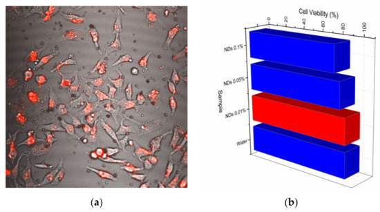 As an example of thermal bioimaging at room temperature, a fluorescence image of the HeLa cells incubated with 100 nm nanodiamonds is shown in Figure 3a. Moreover, their original shape remains unaltered because of a non-cytotoxic interaction. The HPHT FNDs rendered biocompatible (>90%) for concentrations up to 0.1%, as depicted in Figure 3b. We observe that most nanodiamonds are accumulated preferentially on the protuberance generated by the nucleus’ volume (Figure 3a). This feature has been used to indirectly measure the temperature on the malignant cell’s nucleus, which presents a higher gene expression rate and protein production and demands higher energy levels of ATP consumption [73]. The thermal bioimaging for measuring cell temperature of protuberances may be an efficient technique to differentiate between healthy and infected cells [74]. Improvements to thermal bioimage could be achieved with the implantation of selected ions to the surface of FNDs to slow NV− to NV0 conversion energy. Being H, an efficient fluorescent termination as demonstrated by Kratochvílova et al. [75].