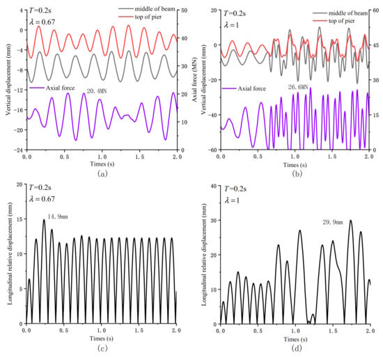 Seismic response of the bridge under different λ: (a) The vertical displacement and contact force response of the bridge when λ = 0.67; (b) The vertical displacement and contact force response of the bridge when λ = 1; (c) Longitudinal relative displacement of pier beam when λ = 0.67; (d) Longitudinal relative displacement of pier beam when λ = 1.