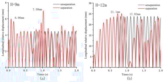 Longitudinal relative displacement of pier beam under different pier height: (a) Longitudinal relative displacement of pier beam under two conditions of separation or not when H = 9 m; (b) Longitudinal relative displacement of pier beam under two conditions of separation or not when H = 11 m.
