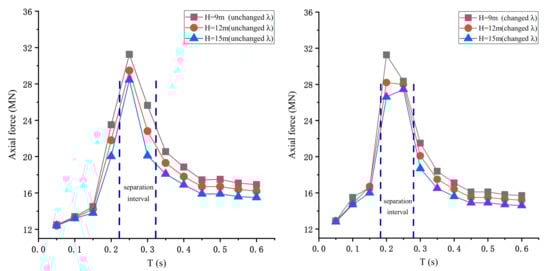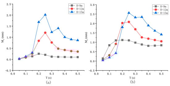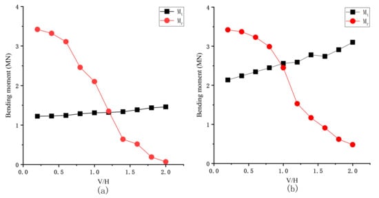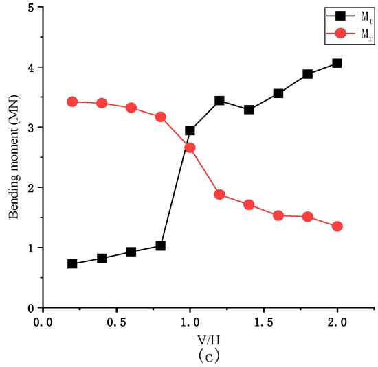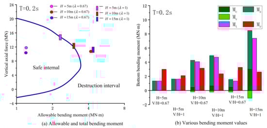 Figure 13 shows the bending moment variation of pier under different vertical excitation amplitudes. As the amplitude of V/H increases, the total bending moment of the bridge pier shows an increasing trend. When H = 15 m, the total bending moment will increase drastically and fluctuate after the structure is separated. The allowable bending moment of the bridge pier decreases monotonously as the vertical collision force increases. It can be seen from Figure 13 that when the height of the pier is low, with the increase of V/H, the damage of the pier is mainly due to the increase in the vertical collision force, which reduces the allowable bending moment of the pier. When the height of the pier is high, the damage is partly due to the decrease in the allowable bending moment, and partly due to the increase in the total bending moment of the pier.