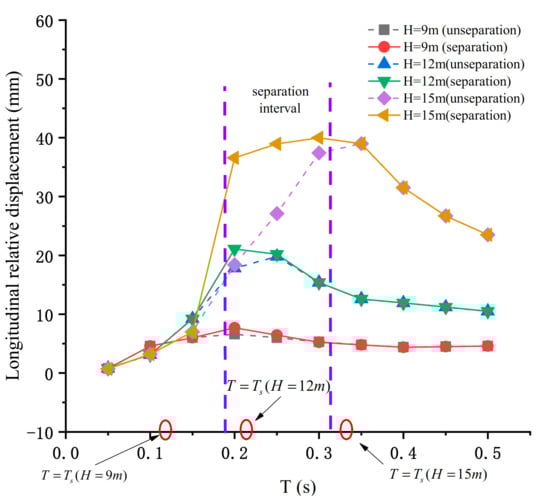 Compared with the vertical contact force, the separation has a more significant impact on the longitudinal displacement response of the structure. When the height of the pier is H = 15 m (. and are the horizontal and vertical natural vibration periods of the bridge, respectively), the maximum longitudinal relative displacement of the pier and beam is 14.9 mm when the separation is ignored. When the structure is separated, the maximum longitudinal relative displacement increases to 29.9 mm, nearly two times.
