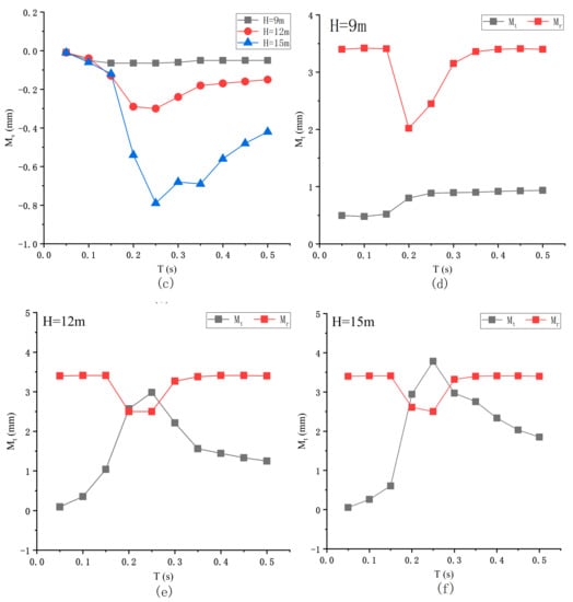 Bending moments at the bottom of the pier under different periods: (a) When H = 9 m total moment and the permissible moment pier; (b) When H = 12 m total moment and the permissible moment pier; (c) When H = 15 m total moment and the permissible moment pier.