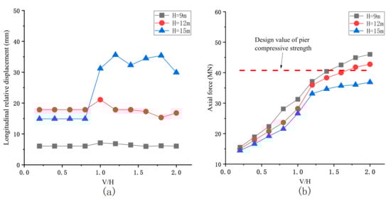 A large number of monitoring data show that the vertical and horizontal acceleration amplitudes of near-field earthquakes are not only more than 2/3 of the code, but sometimes even more than one or even close to two. To study the influence of vertical seismic excitation amplitude on pier failure, Figure 12a shows the variation of longitudinal relative displacement and vertical contact force of pier beam with vertical seismic excitation amplitude when the length of the single-span beam is L = 38m and the pier height is H = 9 m, 12 m and 15 m, respectively. When H = 9 m and 12 m, the amplitude of V/H has little effect on the longitudinal displacement of pier beam. When H = 15 m, the maximum longitudinal relative displacement of pier beam is irregular, which is because the displacement response of the structure after separation is related to the initial position and velocity at the time of separation, and has great randomness. Compared with the longitudinal displacement, V/H has a greater impact on the vertical impact force. It can be seen from Figure 12b that with the increase of V/H, the vertical contact force of the structure increases monotonically, and the smaller the pier height, the greater the increase. When V/H exceeds a certain value, the vertical impact force exceeds the compressive strength of the pier, resulting in compression failure of the pier.