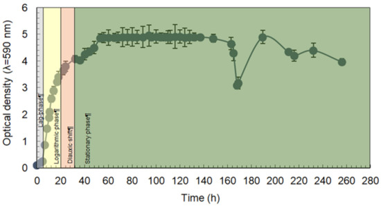 The growth curve of E. magnusii yeast in glycerol-containing medium grown for 260 h. Absorbance was assayed every two hours in cell suspension at the wavelength of 590 nm. The curve is representative of four biological experiments. (The figure was partially used in the article [Microorganisms 2020, 8, 91; doi:10.3390/microorganisms8010091]).