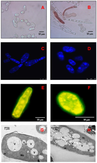 Micro images of the E. magnusii cells in the logarithmic (A,C,E,G) and late stationary (B,D,F,H) growth stages. (A,B)—The cells were stained with neutral red; (C,D). Fluorescent micro-images of the cells, labelled with 0.3 μM DAPI for DNA. (E,F) the potential-dependent stain of the mitochondria in E. magnusii cells by 5 mM JC-1. The regions of high mitochondrial polarization are bright yellow due to the concentrated dye. The cells were examined after 30 min. The incubation medium contained 0.01 M phosphate buffer saline (PBS) and 1% glycerol, pH 7.4. To examine the Rh123-stained preparations, filters 02, 15 (Zeiss) were used (magnification 100×). Photos were taken using an AxioCam MRc camera. (G,H)-ultrastructure of E. magnusii cells. Nu—nucleus; V—vacuole; Mt–mitochondria; CW–cell wall.
