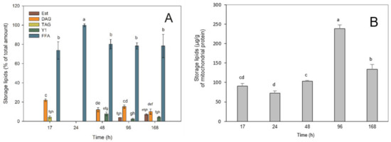 The amount of total storage lipids remained relatively stable during the growth culture up to 96 h when it increased nearly twofold with a concurrent decrease by 168 h of cultivation (Figure 3B).