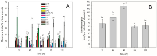Membrane lipid composition of the mitochondria from E. magnusii cells raised in the different growth phases upon ageing during the seven-day cultivation. (A)—the share of each membrane lipid fraction; PE—phosphatidylethanolamines; PC—phosphatidylcholines; CL—cardiolipins; PS—phosphatidylserine; LPE + PI—lysophosphatidylethanolamine + phosphatidylinositols; LPC—lysophosphatidylcholines; SL—sphingolipids; St—sterols; X1, X2—unknown; (B)—the total membrane lipid content. a–m Means with the same letter did not differ significantly.