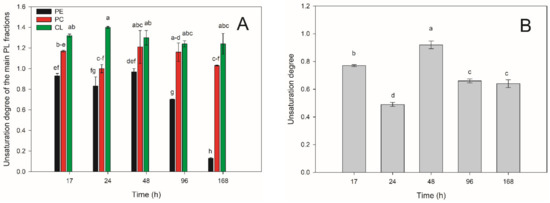 During long-lasting cultivation, the IHD changed due to significant alterations in the unsaturation of some fractions of the membrane lipids. Thus, IHD of PE remained at the same level in all the growth stages except for the 168-h stage, where it decreased sevenfold (Figure 5A). However, it was extremely stable in the PC and CL fractions, which dominate in the PLs of the mitochondrial membranes.