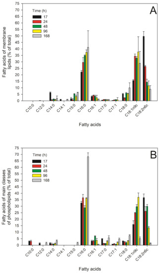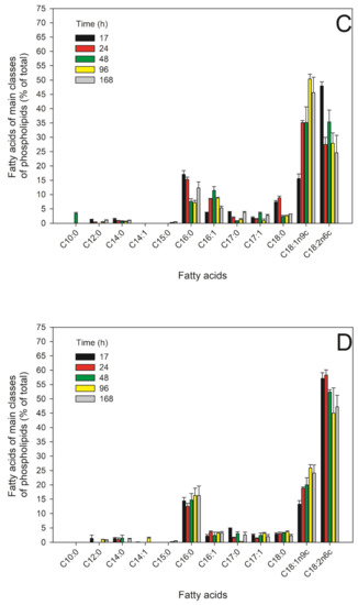 Dominating FAs in the mitochondrial PLs were palmitic (C16:0), oleic (C18:1), and linoleic (C18:2) acids (Figure 6A). In general, during the seven-day cultivation, we could observe the following consistent pattern: (1) palmitic acid (16:0) increased while the level of palmitoleic acid (C16:1) decreased; (2) oleic acid (C18:1) gradually increased with a sharp drop in the 168-h growth stage; and (3) the level of linoleic acid significantly decreased during cultivation being the highest in the early logarithmic stage (Figure 6A).