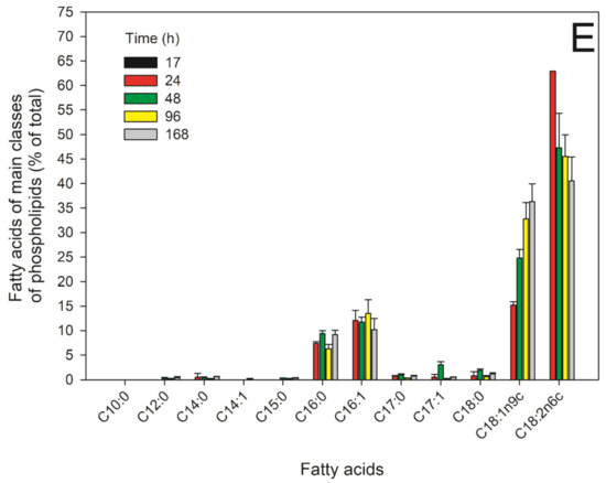 The linoleic acid level in the PE fraction compared to that in the logarithmic stage decreased by 30%, 20%, and 63% in the 24-, 48-, and 96-h growth stages, respectively. Furthermore, by 168 h of cultivation, its level decreased by 26 times. On the contrary, the oleic acid level increased by 1.5, 1.96, and 2.3 times in the 24-, 48-, and 96-h growth stages, respectively, followed by more than a threefold decline in the 168-h growth stage (Figure 6B–E). The palmitic acid level in the PE fraction compared to that in the logarithmic stage doubled in the 168-h stage, but the palmitic acid level in the CL fraction remained constant of about 14–16% throughout the experiment. As for the oleic acid in the CL fraction, its level increased nearly twofold as the culture was ageing and reached 24–25% of the total fatty acid amount in the late stationary phase (Figure 6B–E).