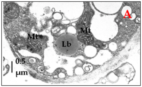Analysis of the dynamics of the respiratory activity in E. magnusii mitochondria using the “oxidative” glycerol showed that it was maintained at a high level during the experiment (Table 1). It should be noted that the coupling parameters a bit decreased, however, the overall mitochondria functions kept up at a high level. The mitochondria AO is activated in the 96- and 168-h growth phases. The results agreed well with our published data on the dynamics of the ROS generation with the maximum in the 96-h growth stage [22]. Thus, the high ROS level in our studies could provoke the induction of the alternative cyanide-resistant pathway, which, in turn, is an element of the antioxidant defense system. This was shown in some papers [33,34,35]. The cyanide-resistant pathway of electron transport is not known to be related to energy storage and leads to a decrease in the ROS generation in the respiratory system, reducing the impact of the stress on the cell. Thus, this pathway induction is one of the ways for the cell to avoid excessive ROS generation under oxidative stress [36,37]. A large amount of storage lipids in the mitochondria, namely FFAs and DAGs, are considered as the second aspect of the high adaptation of E. magnusii upon long-lasting cultivation (Figure 3A,B). Abundant Lb in the yeast cells in the logarithmic (5–6 per a cell) and early stationary growth phases (6–7 per a cell), forming a structural complex with the mitochondria and nucleus (Figure 7A,B) testify to this.
