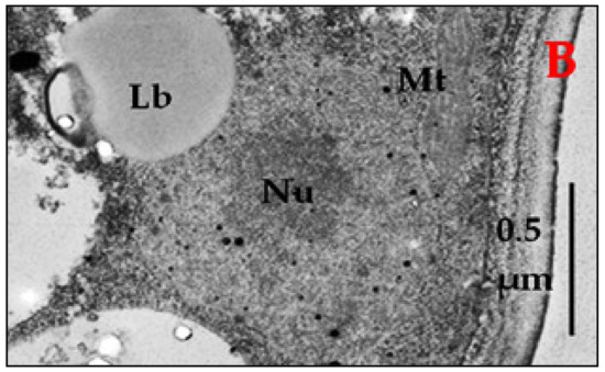 Image of E. magnusii yeast cells in the logarithmic (A) and early stationary growth phases (B). Nu—nucleus; Mt—mitochondria; Lb—lipid bodies.