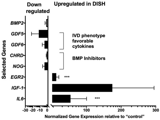 PrimePCR™ screening for 90 genes of the BMP pathway was initially run. Most strikingly, these data revealed a significant mean up-regulation of EGR2 (12.8 ± 7.6-fold, p = 0.0068, overall mean ± SEM of all comparisons) and of interleukin 6 (IL6) (54.0 ± 46.5-fold, p = 0.0005) in DISH-IVDs relative to the “control” discs (Figure 1, Supplementary Figure S1). Furthermore, IGF1 tended to be up-regulated in DISH-IVD donors (174.1 ± 120.6-fold, p = 0.1704), although this was non-significant. Growth and Differentiation Factor 5 (GDF5) and GDF6 both tended to be down-regulated in the DISH-IVDs (i.e., −11.5 ± 10.0, p = 0.26 and −3.7 ± 3.1 p = 0.30, respectively, Figure 1, Supplementary Figure S1). However, these differences were not significant.