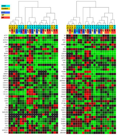 Clustergram displaying hierarchy based on the degree of similarity of expression for different samples and normalised gene expression heat map of relative gene expression at 88 genes of PrimePCR™ of the TGFβ-BMP Signalling Pathway Plus H96. Red indicates up-regulations, green indicates down-regulations and black indicates no regulations. The lighter the shade of colour, the greater the relative normalised expression difference. If no normalised expression value could be calculated, this is shown in black with a white X. Relative gene expression was estimated using ACTB and GAPDH as the two reference genes. Samples encoded in orange are samples categorised as trauma patients = control (C), and samples in light blue are from patients that were diagnosed with DISH (D). Tissue types were colour-coded in dark blue for CEP, in yellow for NP, and in red for AF.