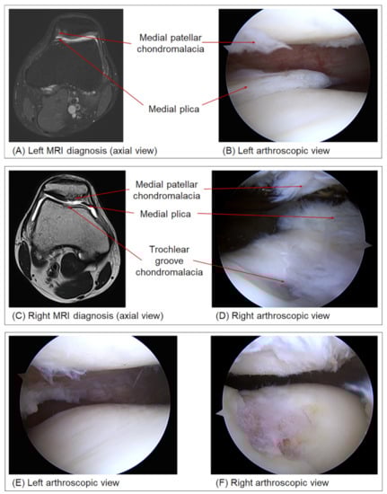 Magnetic resonance images for diagnosis (left: (A); right: (C)) and arthroscopy images (B,D–F). Note that (E,F) are images obtained after surgery.