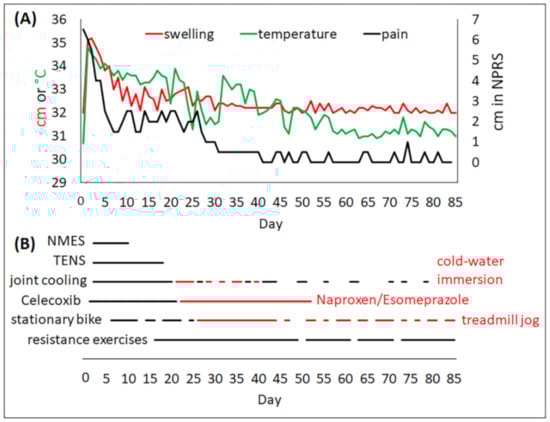 Changes in dependent measurements (A), and time course of postoperative interventions (B). Note that the line colors correspond to the dependent variables on the y-axes (A) and therapeutic interventions (B) with the same font colors. The figure (A) has left (knee joint circumference in cm and knee joint skin temperature in °C) and right (pain perception during daily activities in cm) axes. The lines in figure (B) indicate the days of application in the specific interventions. For example, Celecoxib was administered for the first 21 days, followed by Naproxen/Esomeprazole from day 22 to 52 of rehabilitation. NPRS: numeric pain rating scale; NMES: neuromuscular electrical stimulation; TENS: transcutaneous electrical nerve stimulation.