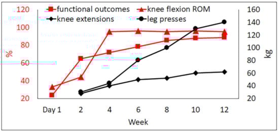 Progression of postoperative interventions (red lines and font) and external loads of resistance exercises (black lines and font). Note that functional outcomes are the average percentages of the scores from the Kujala anterior knee pain scale, International Knee Documentation Committee score, and lower-extremity functional scale. Knee flexion ROM was the percentage of full ROM, 131° measured at initial evaluation and day 0 (the day before surgery). Day 1 indicates the first day of postoperative rehabilitation. ROM: range of motion.
