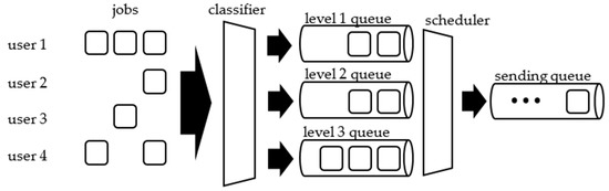 Let us call each user request to be transmitted a ‘job.’ The jobs are basically packets with QoS information. A user should negotiate with a base station to submit a job. He/She may decide not to submit the job if the cost is too expensive. When submitting a job, each user would essentially be requesting that the job be processed for the transmission. The submitted jobs are distributed to the priority queues by a classifier according to their types categorized by their QoS requirements. Here, the framework assumes that there are j types of QoS requirements, and each job is associated with QoS type j. The scheduler chooses a job from the front of a non-empty priority queue according to its scheduling discipline and thrusts the chosen job into the sending queue. For example, a scheduler using a priority queuing (PQ) discipline serves the job with the highest priority first and uses all the bandwidths to send the jobs in the sending queue. By contrast, a scheduler using a weighted fair queuing (WFQ) discipline would allocate the bandwidths to each priority queue according to its weight [34]. Subsequently, the base station and the corresponding UE would prepare the radio resource to transmit the jobs. A scheduling model is shown in Figure 1.