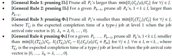 Rule 3 prunes all ’s, which guarantees that all jobs will choose level 1. The highest price of the level 1 to guarantee that all of the jobs select level 1 is (i.e., for all ), where is the expected completion time of a type-j job at level 1 when the job arrival rate vector is {0, λ, 0}. can be computed using Equation (1).