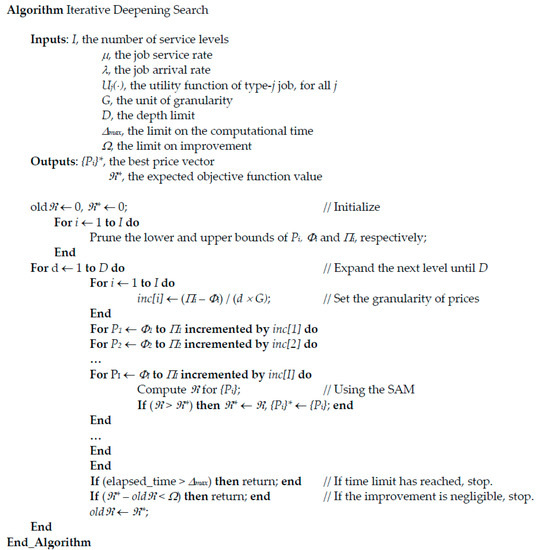 After pruning has been performed, the algorithm explores the remaining search space using the heuristic search method. The algorithm adopted the “iterative-deepening” search [39], which combines the benefits of performing both a depth-first search and breadth-first search. The process begins by coarsely selecting the price vectors from the search space and then gradually tries out the other price vectors, while increasing the granularity of prices until either the computational time limit has been exhausted or the pre-set search depth limit has been reached. The algorithm also stops if the improvements between the results are negligibly small. The pseudocode for the search algorithm is shown in Figure 7.