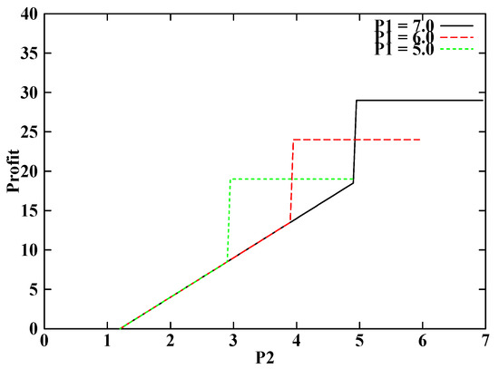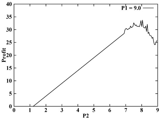 Figure 11 illustrates that the system does not necessarily converge to a stable state if the price vector belongs to the unpruned zone. Rule 4 determines the range of for a given . In the case of = 9.0, P2 below 6.5 always converges on a scenario that all jobs choose level 2 so that it can be pruned (see the straight line in Figure 11). However, the system oscillates for above 6.5, and the system objective cannot be trivially computed (see the rugged line in Figure 11). My scheme applies the iterative-deepening search on the unpruned region and obtains the best price vector of {= 8.90, = 8.00}. The corresponding expected profit is 35.04. The parameters for the iterative-deepening search were set as G = 10, D = 5, Δmax = ∞, and Ω = 0. The equilibrium methods utilized about 83% of the network capacity because of the oscillation, but the proposed method let users fully utilize the capacity in this example.