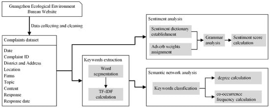 Figure 2 describes the text mining process framework for Chinese environmental complaints. For the sake of content analysis and text mining, we cleaned the collected text data, including removing non–text data (punctuation marks, emoticons, and meaningless symbols), invalid characters (letters and numbers), and meaningless text (function words and pronouns). We removed the meaningless text by using some open–source Chinese stop word dictionaries (e.g., Harbin Institute of Technology (HIT) stop words and Baidu TM stop words). Then, we carried out data processing, including keyword extraction, sentiment analysis, and semantic network analysis.