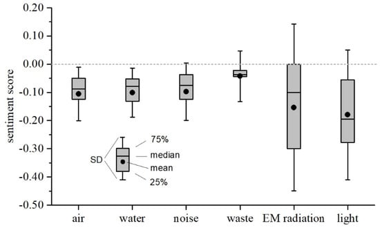 The box plot (Figure 4) shows that the mean (air: −0.11; water: −0.10; noise: −0.10; waste: −0.04; EM radiation: −0.15; light: −0.18) and median (air: −0.09; water: −0.08; noise: −0.08; waste: −0.04; EM radiation: −0.10; light: −0.19) of all types of environmental complaint sentiment are both lower than zero, which indicates that the complainants’ overall sentiment tendency is negative. Comparing the mean and median of various environmental complaints, electromagnetic radiation and light have the lowest value. The sentiment value distribution of electromagnetic radiation is the most scattered (0.30), followed by light (0.23), which is presumably due to the wide differences between cognitive and individual. There is little difference in the sentiment value distribution of air, water, and noise pollution complaints.