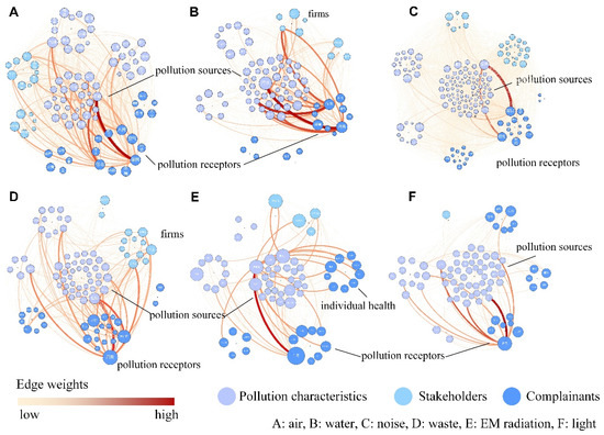 As shown in Table 7, we identified the proportion of clusters and sub–clusters in semantic networks. From the semantic network node, the pollution characteristic is the largest cluster of each network. Except for noise complaints, cluster 3 (complainant) has a higher proportion than cluster 2 (stakeholder). This suggests that individuals making the complainants pay most attention to pollution characteristics, especially the sub–cluster pollution source, followed by their impacts. Stakeholders account for the smallest proportion, which may indicate the least understanding of this cluster of complainants.