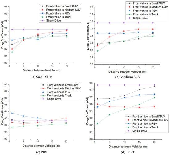 As shown in Figure 2b, similar trends were observed for the drag coefficient, except when using the PBV as the leading vehicle. In these cases, such as when the leading vehicle is the small SUV, the change in the drag coefficient under separation distances of 15 m and 20 m was small owing to the effect of the intensification of the wake of the leading vehicle.