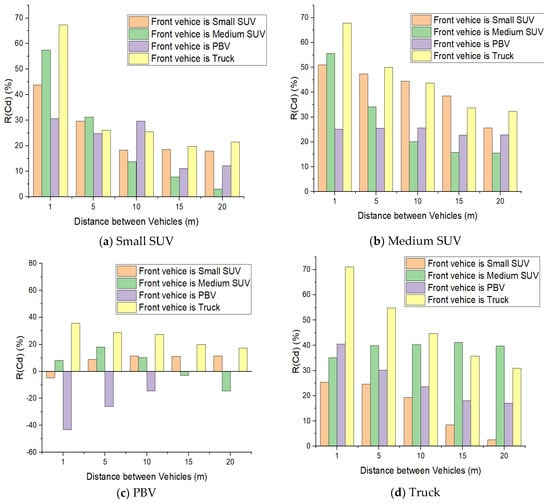 Variation in drag coefficient with respect to the leading (front) vehicle type when the following (rear) vehicle is the (a) small sport utility vehicle (SUV), (b) medium SUV, (c) purpose-based vehicle (PBV), and (d) truck.