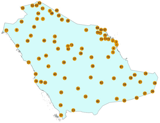 Hourly values of the direct, Hb,0 (in Wm−2), and diffuse, Hd,0 (in Wm−2), horizontal solar radiation components were downloaded from the PV—Geographical Information System (PV-GIS) tool [31] using the latest Surface Solar Radiation Data Set—Heliostat (SARAH) 2005–2016 data base (12 years) [32,33]. This platform has been chosen for retrieving solar radiation data through a user-friendly tool that provides data for any location in Europe, Africa, Middle East including Saudi Arabia, central and southeast Asia and most parts of the Americas. Nevertheless, the platform provides solar maps for Europe, Africa, Turkey and central Asia only. The methods used by PV-GIS to calculate solar radiation from satellite are described in various works [30,34,35]. A set of 82 sites was arbitrarily chosen in order to cover the whole area of Saudi Arabia. Table 1 gives the names and the geographical coordinates of these sites, while Figure 1 shows their location in the map of the country. It should be noted here that the selection of the sites was based on the “inhabited” criterion (i.e., urban areas, 57 out of a total of 82); other 25 sites were added to the 57, but refer to uninhabited regions (sites with no names in Table 1). For this reason, the dispersion of the 82 sites is not uniform within Saudi Arabia. There should also be mentioned here that the downloaded hourly solar horizontal radiation values refer to those from an unobstructed horizon (no effect of the ground on solar radiation) by not selecting the “calculated horizon” option in the PV-GIS tool.