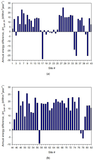 (a) Differences of annual maximum solar energy sums, ΔHg,opt. βS, on flat planes with optimally-derived tilt angles Figure 1. and (b) 44–82, under all-sky conditions and averaged over the period 2005–2016. ΔHg,opt. βS = Hg,opt. βS/ρg. − Hg,opt. βS/ρg0, where opt. β refers to the angles shown in Table 2 for both ground-albedo cases of ρg and ρg0.