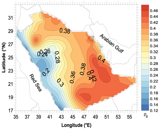 Distribution of the annual mean ground-albedo, ρg, values over Saudi Arabia in the period 2005–2016. The x-axis is the geographical longitude, λ, and the y-axis is the geographical latitude, φ (both in degrees).