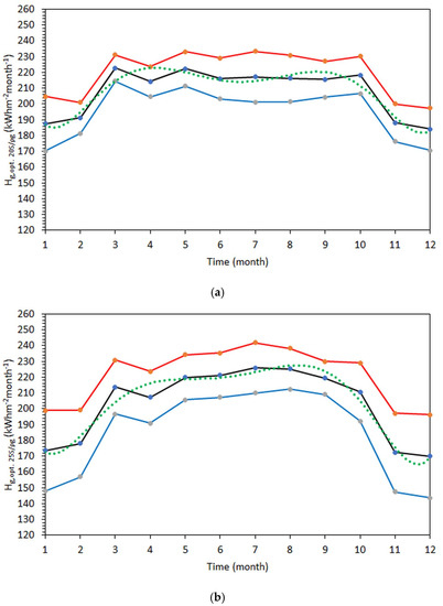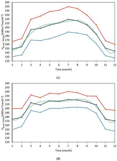 For estimating global solar irradiance on an inclined plane facing south, Hg,βS (in Wm−2), the isotropic model of Liu-Jordan [41] was adopted (β is the tilt angle of the inclined plane in respect to the local horizon, in degrees). The isotropic model was used to estimate the ground-reflected radiation from the surrounding surface, Hr,βS (in Wm−2), received on the inclined flat surface. This model has been adopted in the present study because it has proved as efficient in providing the tilted total solar radiation in many parts of the world as other more sophisticated models [42]. For a south-facing surface the received total solar radiation is given by [43]: